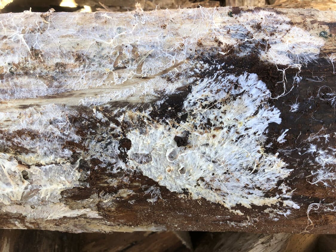 Exempel på mögel på ved. Om du tydligt ser mögel på veden, kasta den då. Denna ved är nämligen inte lämplig att bränna. Bilden kommer från Mapleseed.farm.