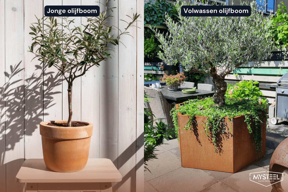 “Unga olivträd växer snabbare än vuxna olivträd. Tänk på detta när du väljer din planteringskärl. Annars finns risken att du behöver köpa en ny, större planteringskärl om ett år.”