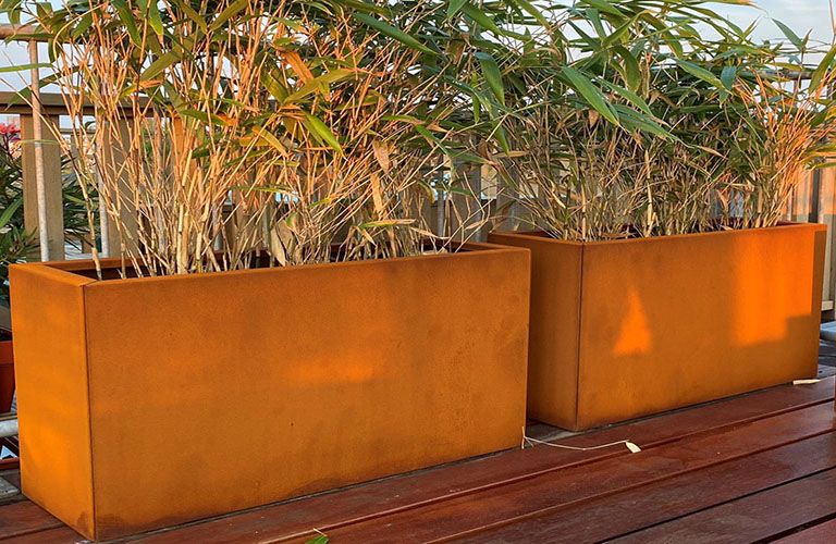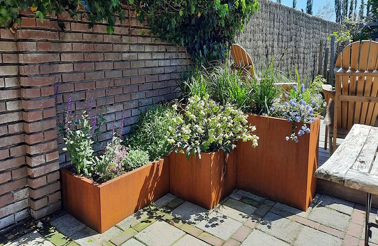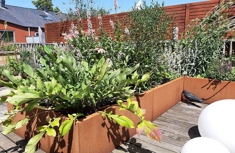 Vår kund har skapat mer privacy genom att placera höga cortenstål planteringslådor på sidan av terrassen. Idealiskt när du vill sitta på terrassen med en drink på kvällen, men ändå vill avskärma dig från nyfikna grannar. Cortenstål planteringslådorna tillsammans med högt gräs eller bambu ger en alltid grön trädgårdsskärm och en solig känsla. Den cortenstål planteringslådan som används som avskiljning i trädgården har en storlek på 1200x300x600 mm (längd x bredd x höjd). Denna planteringslåda tar lite plats på marken, men ger maximal effekt.
