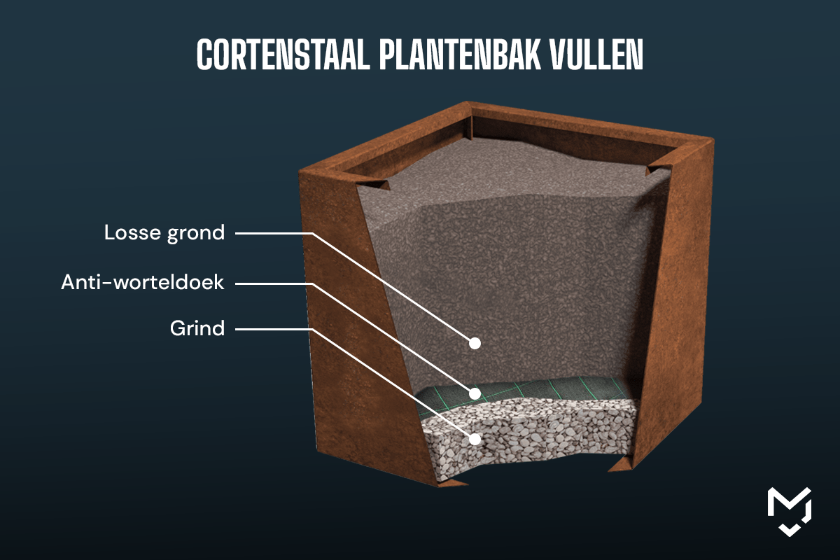 - Det är viktigt att fylla en cortenståls planterlåda på rätt sätt och att använda rätt material. På så sätt får dina växter den bästa miljön för att växa.