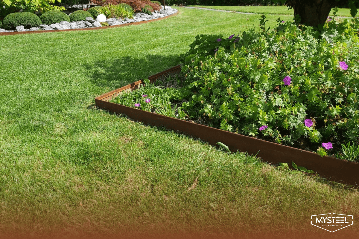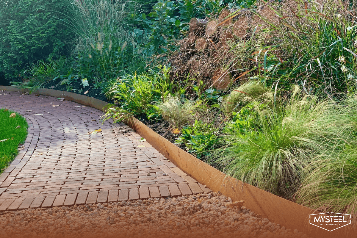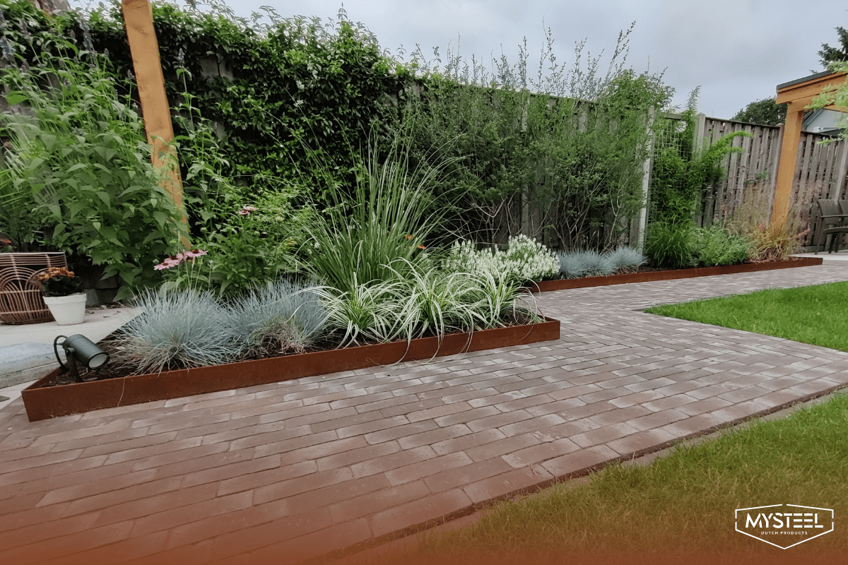 Kantstenar hjälper till att definiera och accentuera olika trädgårdsdelar. De erbjuder tydliga gränser och betonar avgränsningen av olika zoner i din trädgård. I bilden nedan är kantstenen av cortenstål också kombinerad med en cortenstålplanteringslåda.