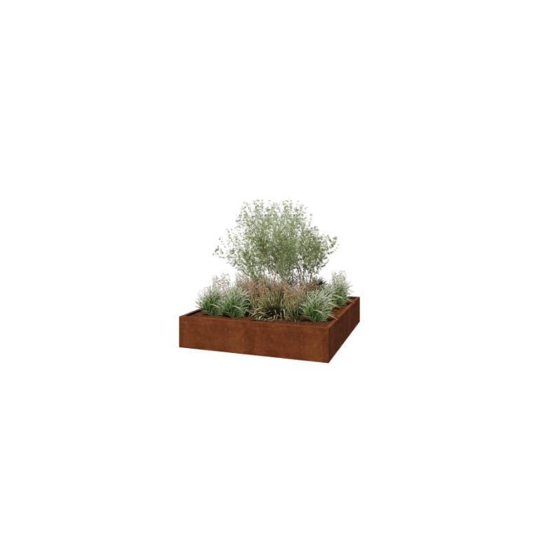 Den fyrkantiga cortenstålskrukan är perfekt för stora prydnadsgräs, små träd eller färgstarka blommande växter. Eftersom den levereras utan bottenplatta kan du enkelt placera den direkt på jord eller gräsmatta, vilket gör att den smälter vackert in i en naturlig trädgårdsmiljö. Dess rena och stilrena form passar utmärkt i både moderna och industriella trädgårdsstilar och framhäver det gröna på ett kraftfullt sätt.
