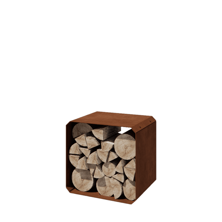 Vedstället mäter 40 x 40 x 40 cm och är tillverkat av 3 millimeter tjockt cortenstål. Kuben levereras med monteringsmaterial för enkel och snabb montering. När den är ihopsatt står den stadigt och är redo att användas direkt.